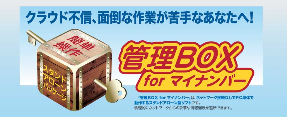 『管理BOX for マイナンバー』とは、マイナンバーをネットワーク接続なしでPC単体で管理するスタンドアローン型ソフトウェアです。